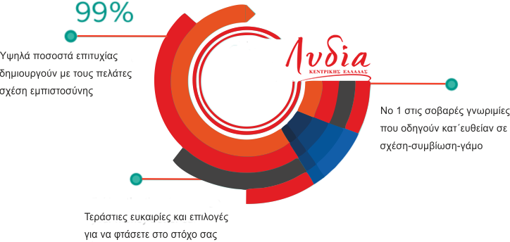 Το γραφείο γνωριμιών ΄΄Λυδία Κεντρικής Ελλάδος΄΄ μέσα από ειδικούς συνεργάτες σας φέρνει κοντά στο προφίλ του ανθρώπου που ψάχνετε. Παρέχουμε βοήθεια ώστε να έχετε μια πιο προσωπική επαφή με έναν άνθρωπο που είναι κοντά στα δικά σας ενδιαφέροντα. Αν πραγματικά επιζητάς τη συντροφικότητα με ένα σοβαρό άνθρωπο, αλλά θεωρείς δύσκολη υπόθεση την ανεύρεση συντρόφου, είμαστε εδώ για σένα